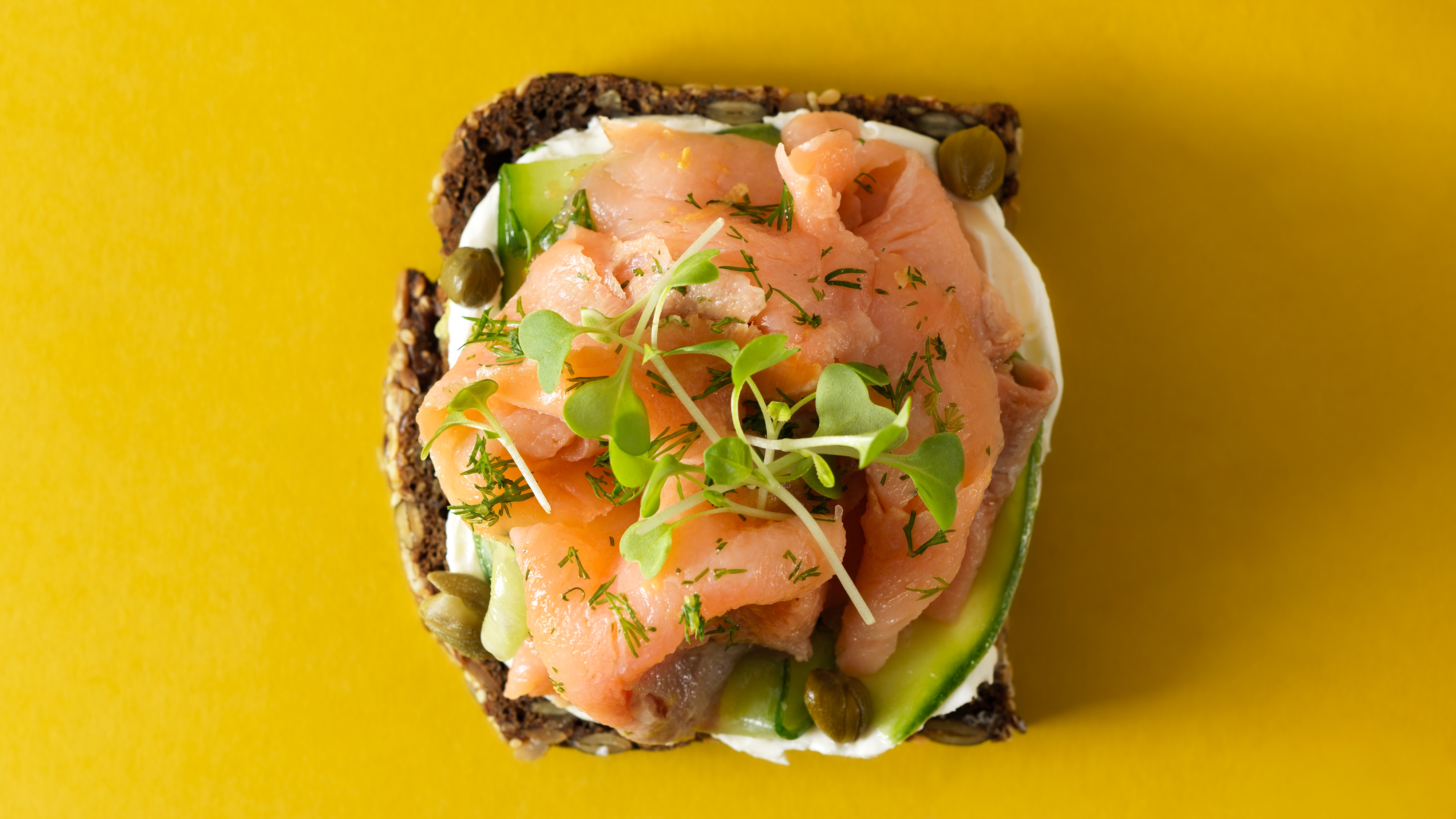 Multiseed Bread, Cream Cheese Mix (Cream Cheese, UHT Cream, Olive Oil, Lime Zest, Lemon Zest, Salt, Pepper), Smoked Salmon, Olive Oil, Dill, Lemon Zest, Capers, Fresh Cucumbers, Shiso Mix Cress (Micro Herbs).
