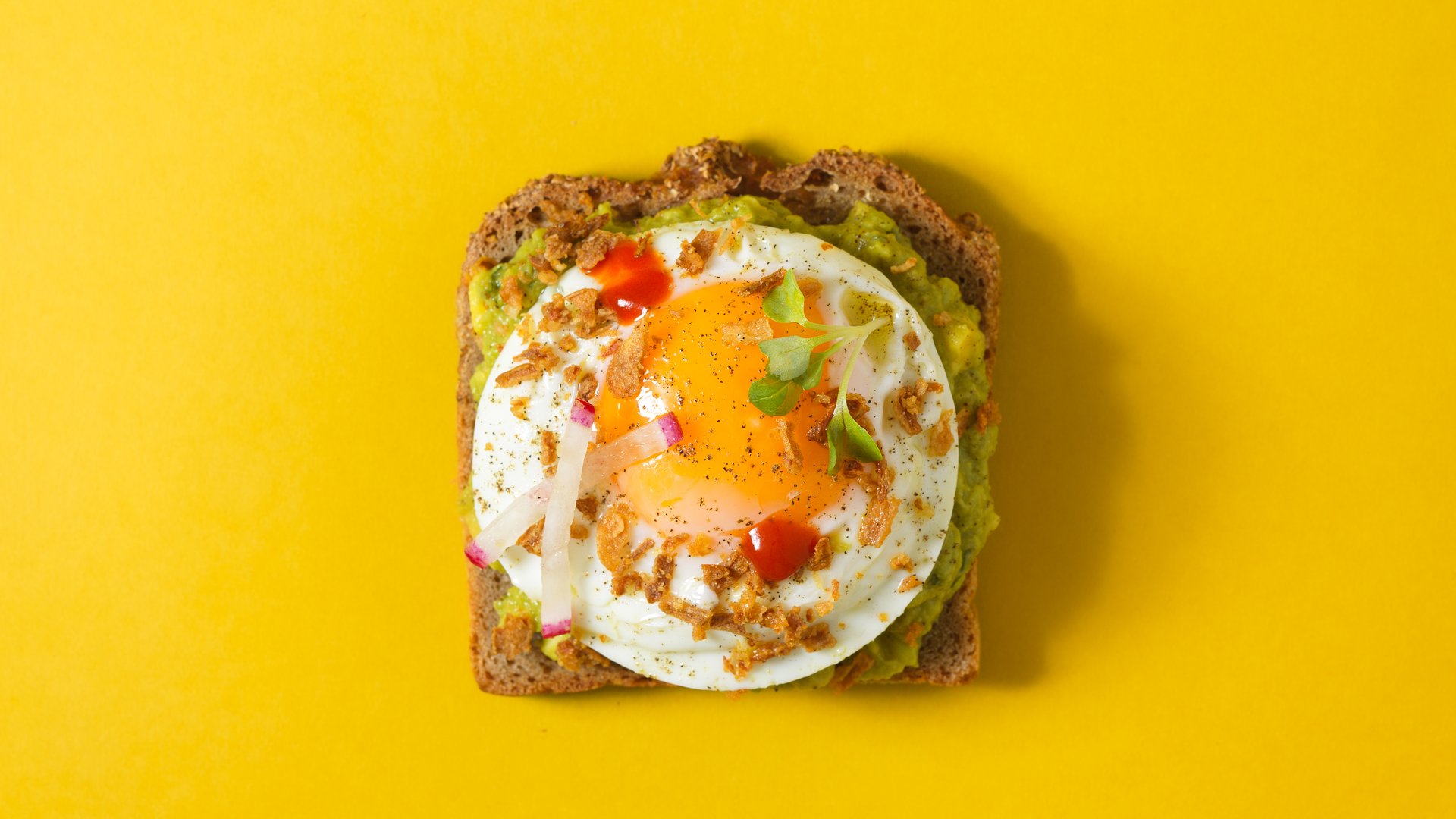 Rye Bread, Guacamole Paste (Avocado, Guacamole Ready Paste, Red Onion, Tomatoes, Coriander, Lemon Juice, Lime Juice and Zest, Lemon Zest, Salt, Pepper, Monosodium Glutamate, Cayenne Pepper), Fried Egg, Salt, Pepper, Crispy Fried Onion, Radish, Sriracha Sauce.